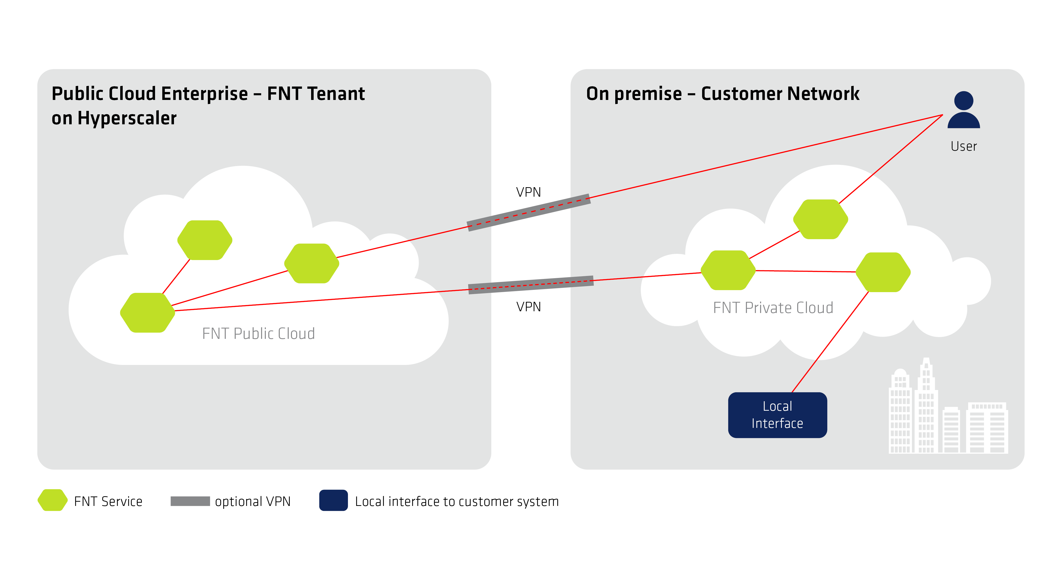 Dadurch können Sie die FNT-Lösungen flexibel und passend zu Ihren individuellen Anforderungen in verschiedenen Betriebsmodellen einsetzen – von Private Cloud, über Public Cloud bis hin zur Hybrid Cloud. Unterstützt wird der Betrieb auf kundeneigener Infrastruktur sowie bei jedem beliebigen Hyperscaler wie etwa Amazon Web Services (AWS), Microsoft Azure oder Google Cloud Platform (GCP).